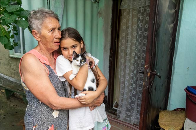 Sjuscha (12 Jahre, links), Oliver (11 Jahre), Valeria (11 Jahre) leben zusammen mit der Mutter der beiden Mädchen, einer Oma und einer weiteren Verwandten in einem Appartement mit etwa 30 Quadratmetern. Die Unterkunft ist in drei Zimmer und eine Küche aufgeteilt. Ein Holzofen heizt die Wohnung. Im Winter 2021/22 reichte das Holz nur zum einmaligen Heizen pro Tag. So kühlte das Haus bis zum Abend auf 10 Grad ab, bevor wieder angefeuert wurde.